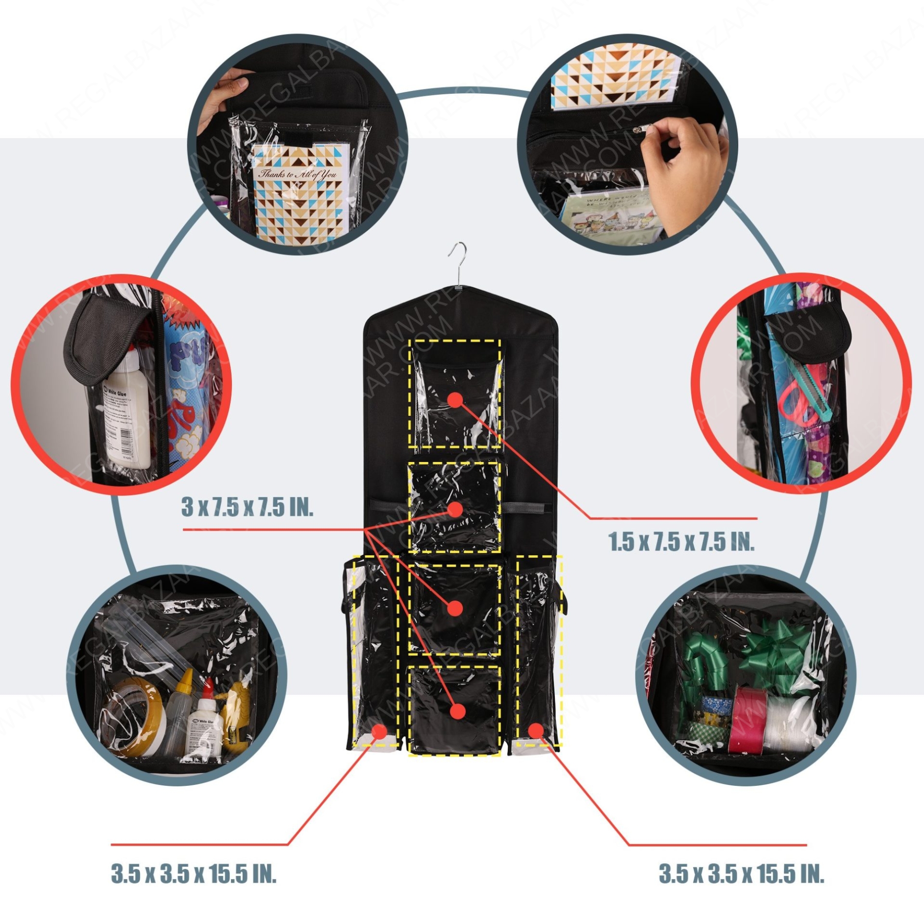 EASY TO USE. The dual-sided hanging organizer is 40”x 16”. It is lightweight and can be hung in no-time. This high-quality product can be used to store a variety of gift-wrap items.